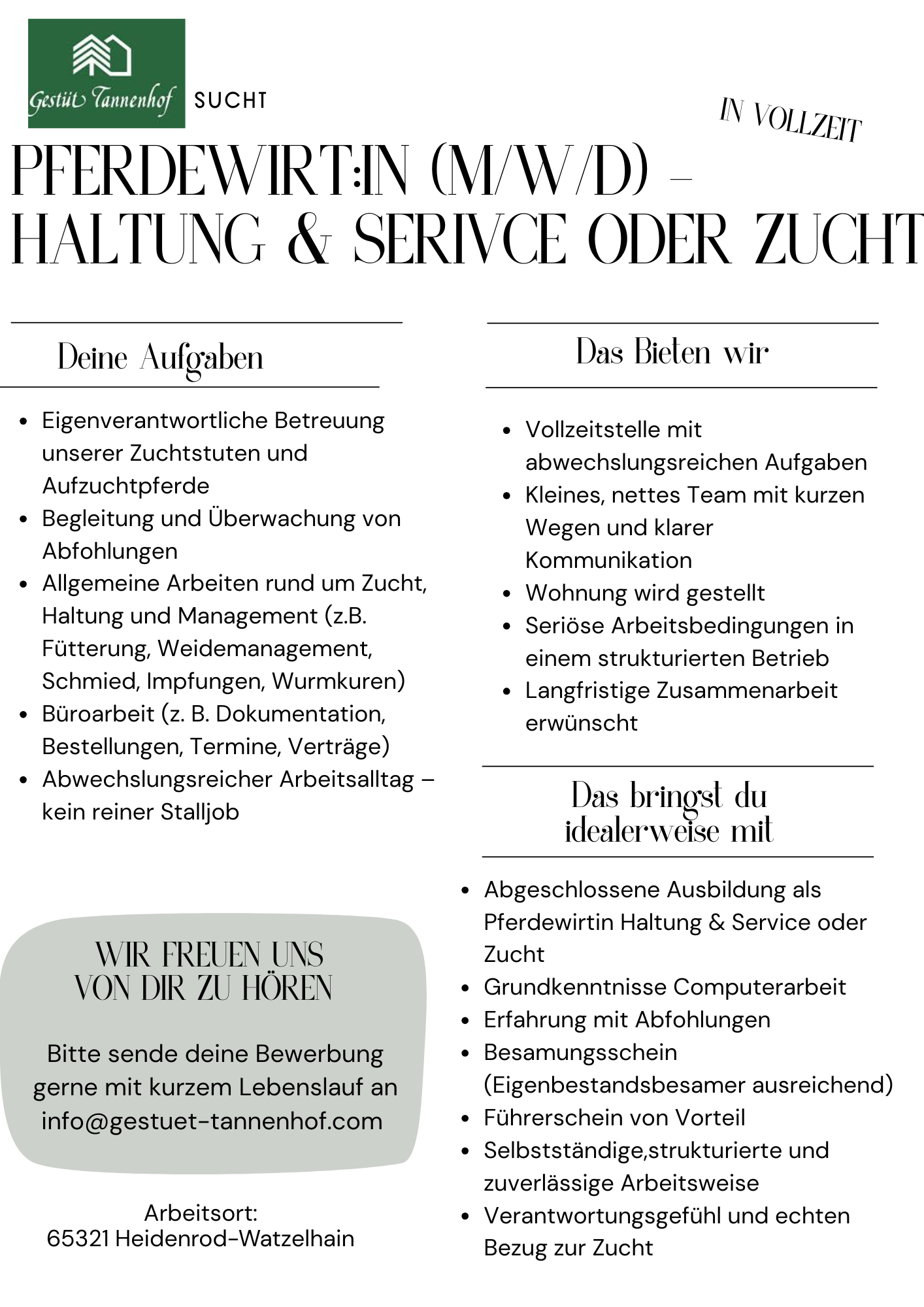 📩 Bewerbung: formlos, gern mit kurzem Lebenslauf an info@gestuet-tannenhof.com