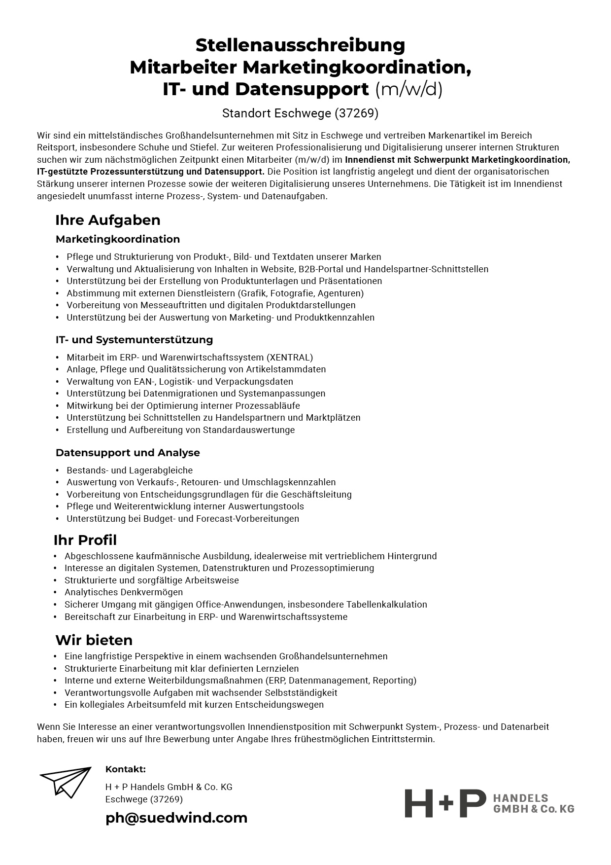 Wir sind ein mittelständisches Großhandelsunternehmen mit Sitz in Eschwege und vertreiben Markenartikel im Bereich Reitsport, insbesondere Schuhe und Stiefel. Zur weiteren Professionalisierung und Digitalisierung unserer internen Strukturen suchen wir zum nächstmöglichen Zeitpunkt einen Mitarbeiter (m/w/d) im Innendienst mit Schwerpunkt Marketingkoordination, IT-gestützte Prozessunterstützung und Datensupport.